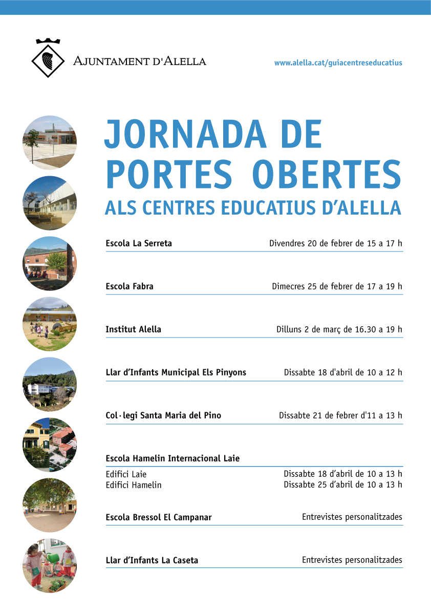Portes obertes. Els centres educatius d'Alella han programat jornades de portes obertes per donar a conèixer les instal•lacions i els seus projectes educatius davant de la convocatòria del procés de preinscripcions per al curs 2015-2016 previst per al mes de març.