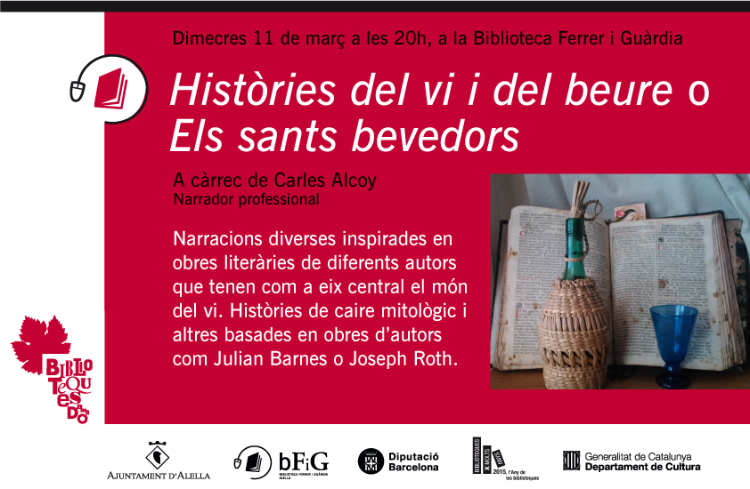 Històries del vi del beure o Els sants bevedors, espectacle per a adults a càrrec de Carles Alcoy. Narracions diverses inspirades en obres literàries de diferents autors que tenen com a eix central el món del vi. Històries de caire mitològic, i també d'altres basades en obres d'autors com Julian Barnes o Joseph Roth.