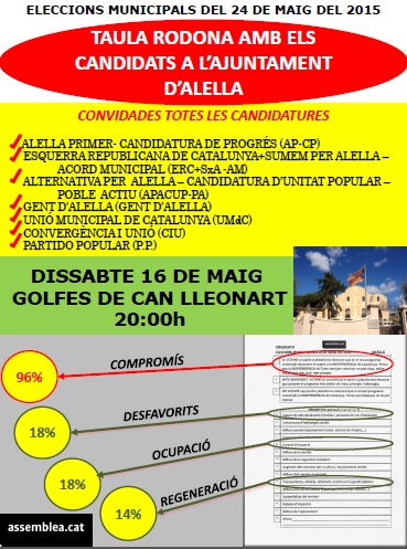 L'ANC Alella organitza una taula rodona en la qual s'ha convidat a participar a totes les candidatures que es presenten a Alella a les properes eleccions municipals del 24 de maig. L'acte és obert a tothom i es farà el proper dissabte 16 de maig a les 20h a Can Lleonart.