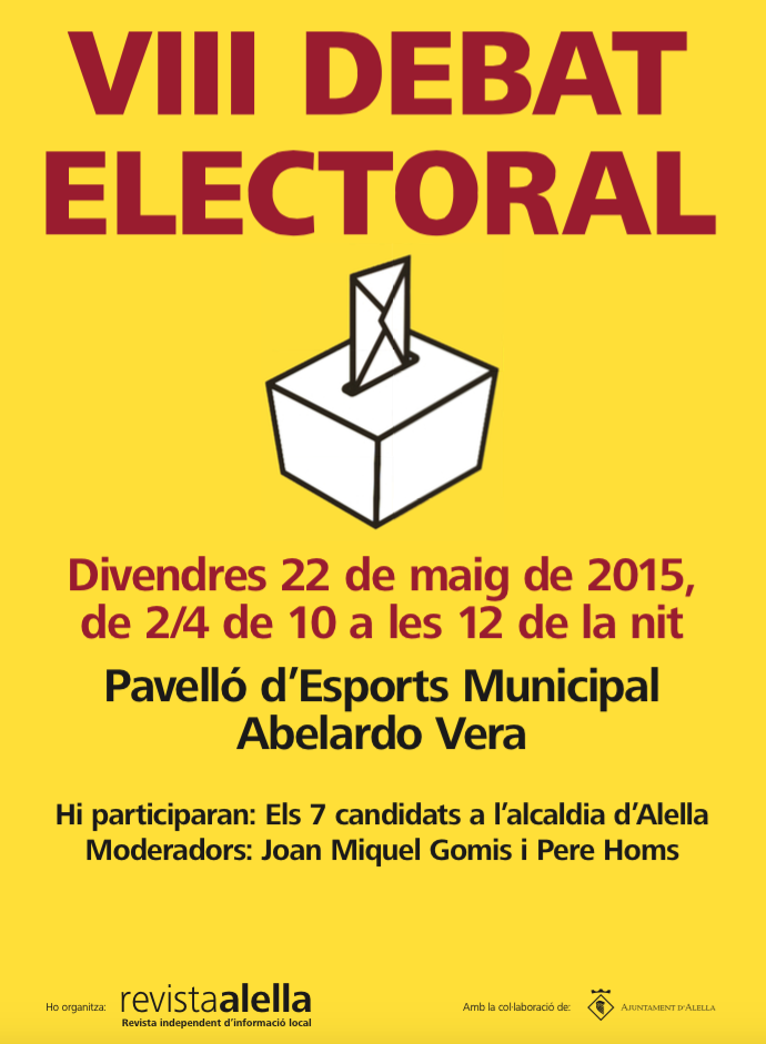 La Revista Alella organitza el VII Debat Electoral en el qual s'ha convidat a participar als caps de llista de les set candidatures que es presenten a Alella a les properes eleccions municipals del 24 de maig. El debat serà moderat per Joan Miquel Gomis i Pere Homs i es farà el divendres 22 de maig a les 21.30h al Pavelló Municipal d'Esports.