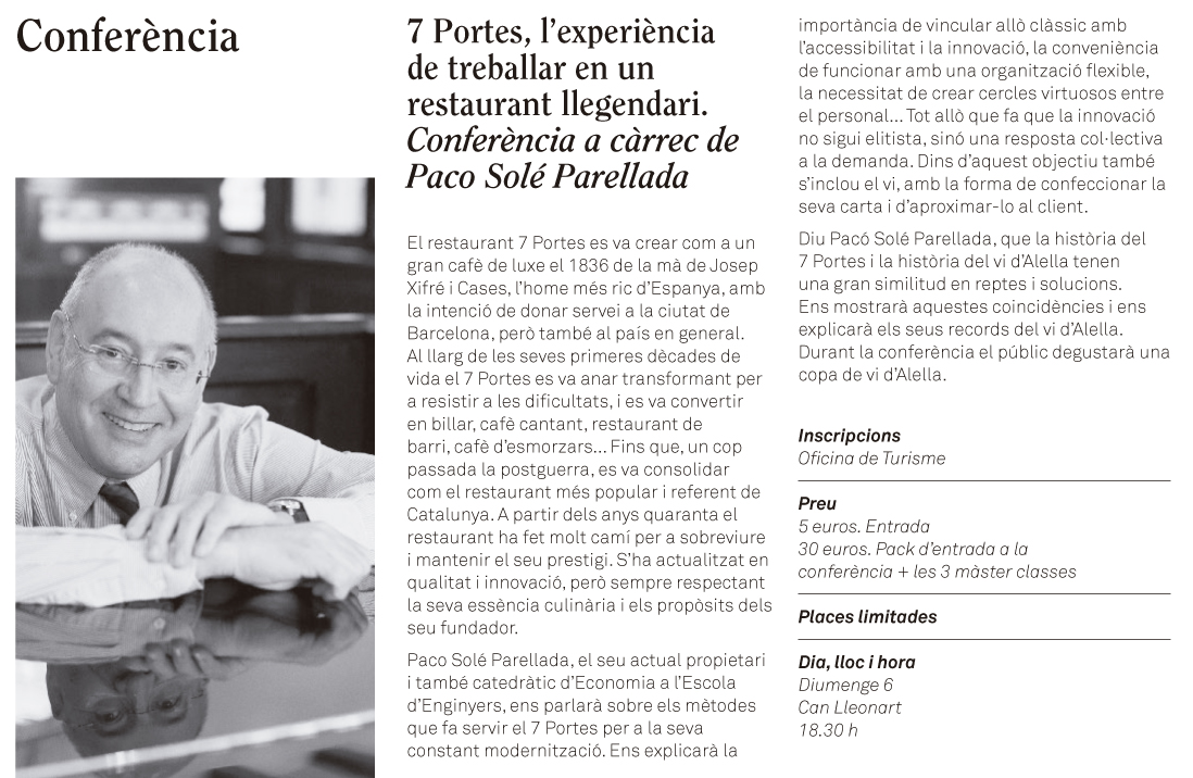 Diu Pacó Solé, que la història del 7 Portes i la història del vi d'Alella tenen una gran similitud en reptes i solucions. Ens mostrarà aquestes coincidències i ens comptarà els seus records del vi d'Alella. Durant la conferència el públic degustarà una copa de vi d'Alella.