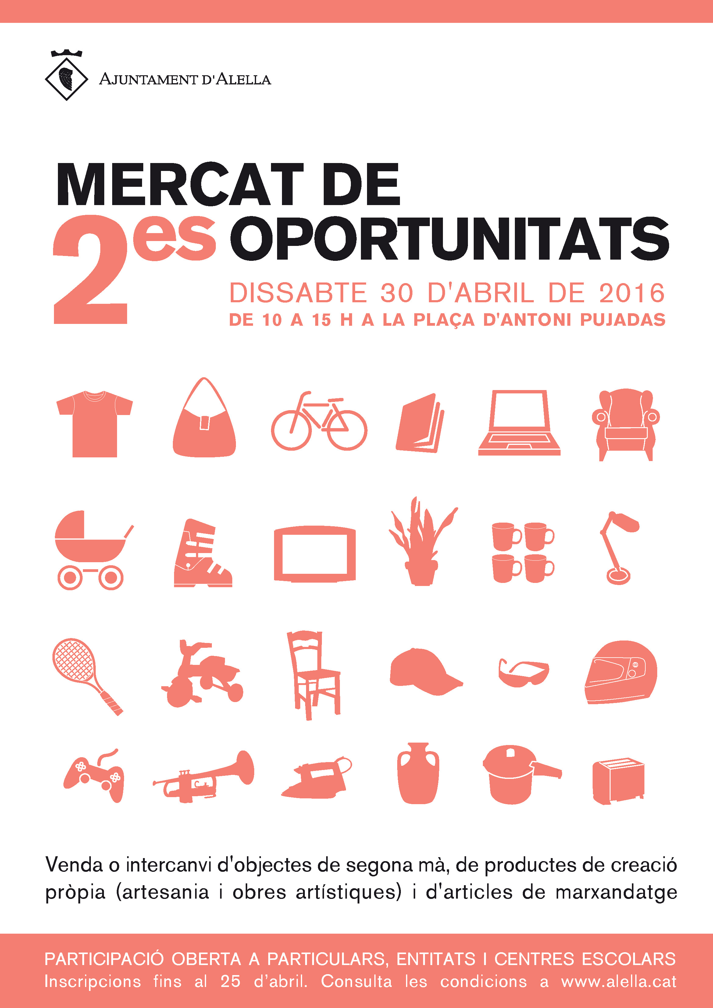 Mercat de Segones Oportunitats. El mercat és obert a majors de 16 anys no professionals, les entitats i els centres escolars, perquè puguin vendre o fer intercanvi d'articles de segona mà, productes de creació pròpia i material de marxandatge. Inscripcions del 4 al 25 d'abril. Més informació a www.alella.cat/mercatoportunitats.