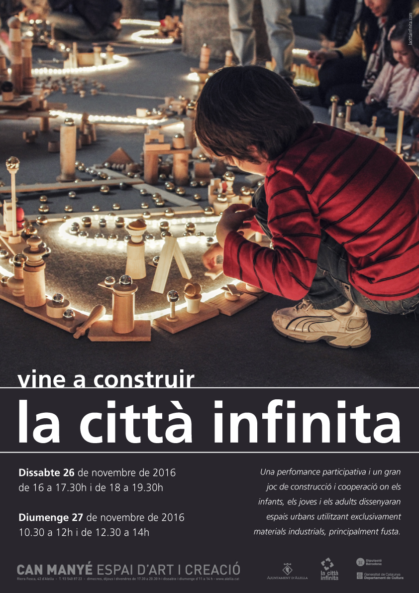 La città infinita. Taller participatiu, un treball en equip, un gran joc de construcció i cooperació per crear i recrear espais urbans, utilitzant, exclusivament residus industrials, principalment de fusta. De fet, la città infinita és un esdeveniment sostenible i potencialment infinit, perquè respecta el medi ambient. Adreçat a infants a partir de 4 anys.