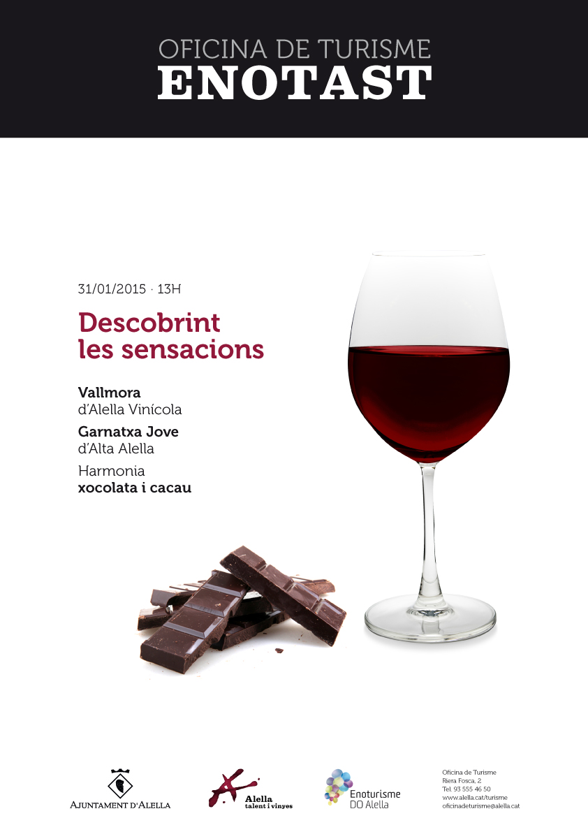 Enotast. Descobrint les sensacions. Tast de Vallmora (Alella Vinícola) i Garnatxa Jove (Alta Alella) amb xocolata i cacau. Preu: 6 euros. Inclou el tast de 2 vins amb degustació gastronòmica.
