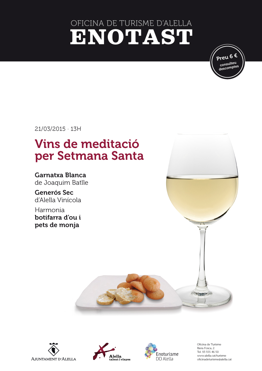 Enotast. Tast de Garnatxa Blanca (Joaquim Batlle) amb Generós Sec (Alella Vinícola) amb botifarra d'ous i pets de monja. Preu: 6 euros. Més informació: Oficina de Turisme 93 5554650 oficinaturisme@alella.cat i www.alella.cat/turisme