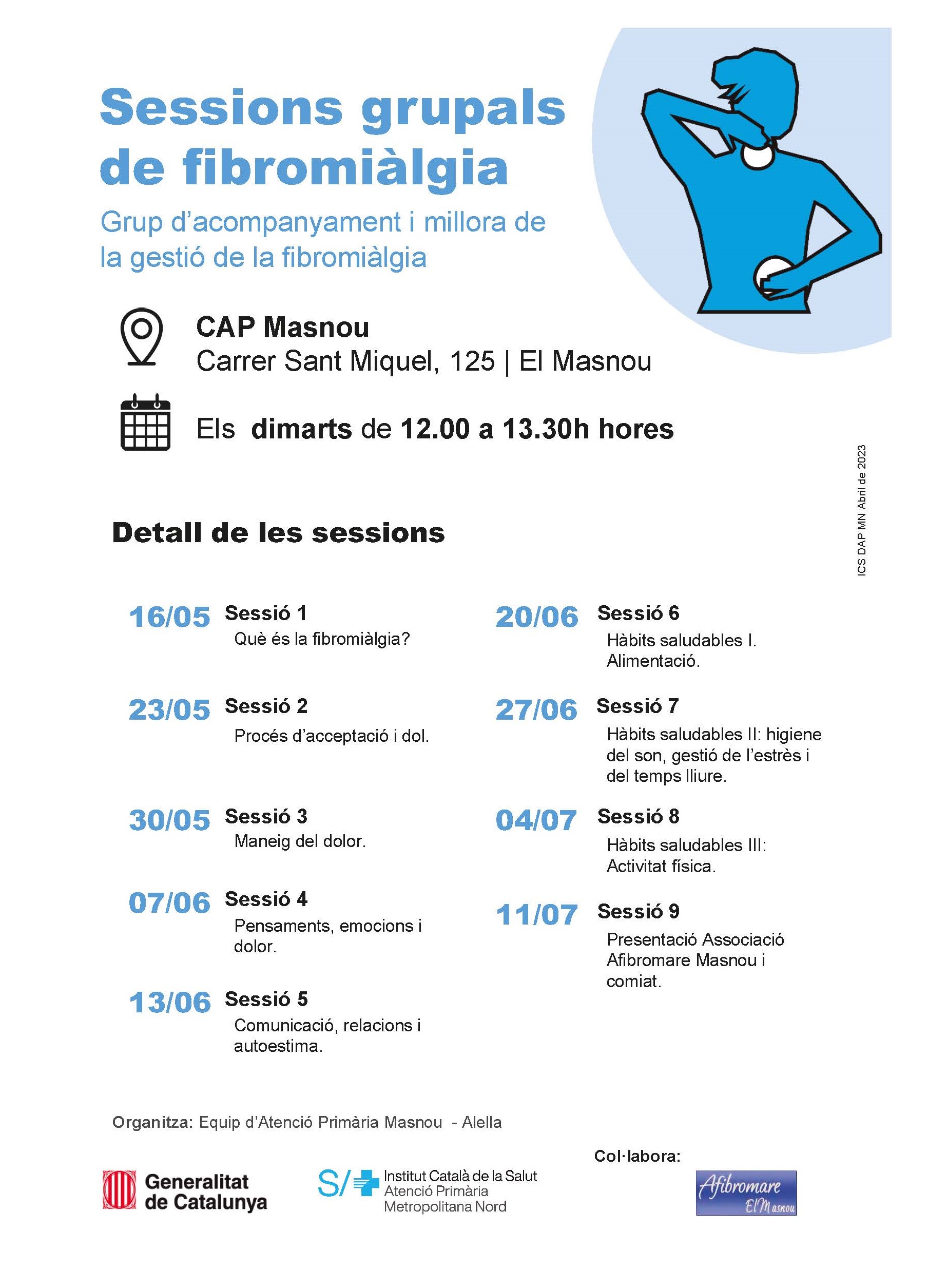 El dimarts 16 de maig comencen les sessions grupals d'acompanyament i millora de la gestió la fibromiàlgia. Són 9 sessions que es faran fins a l'11 de juliol, tots els dimarts de 12 a 13.30 h.