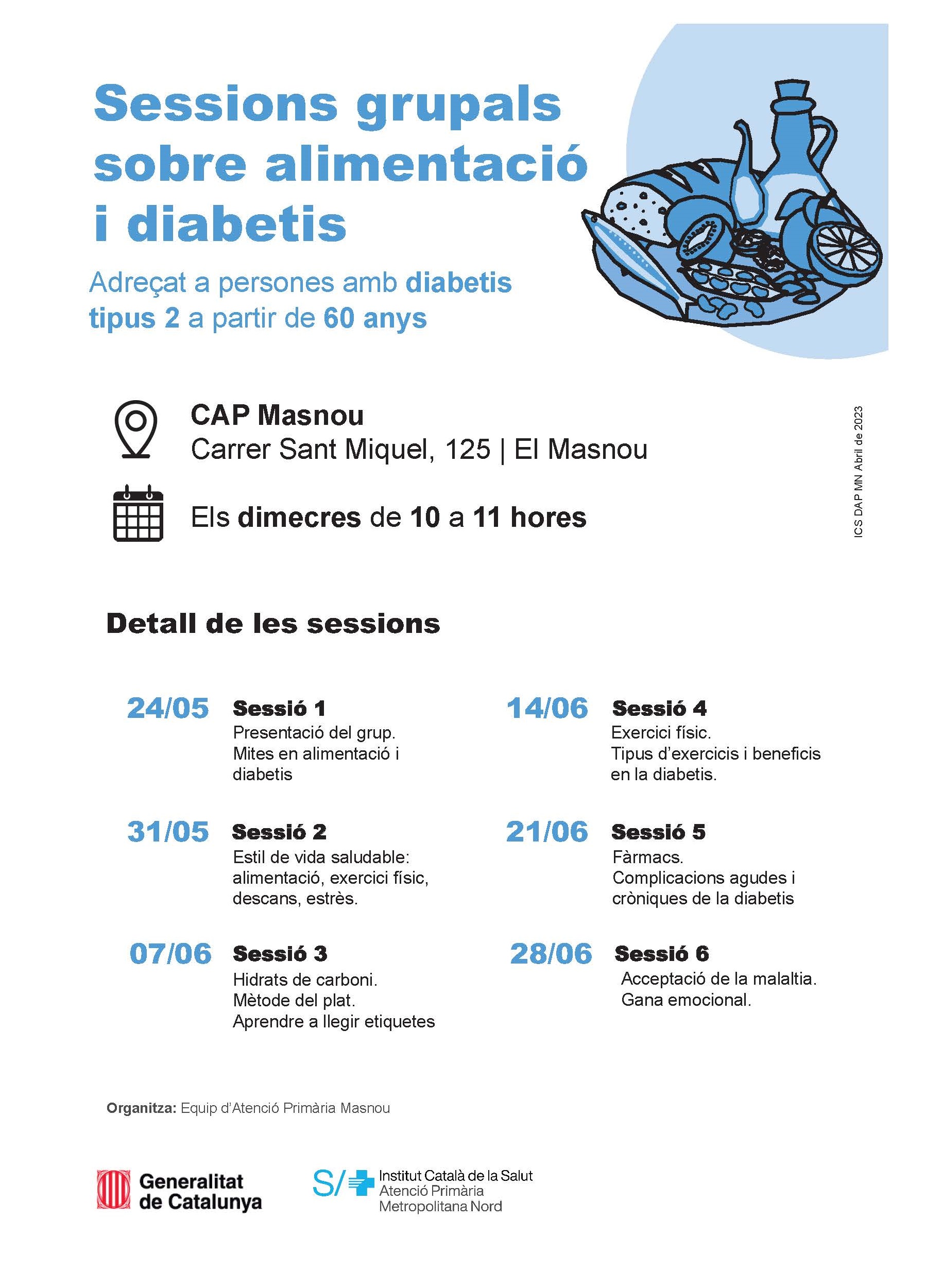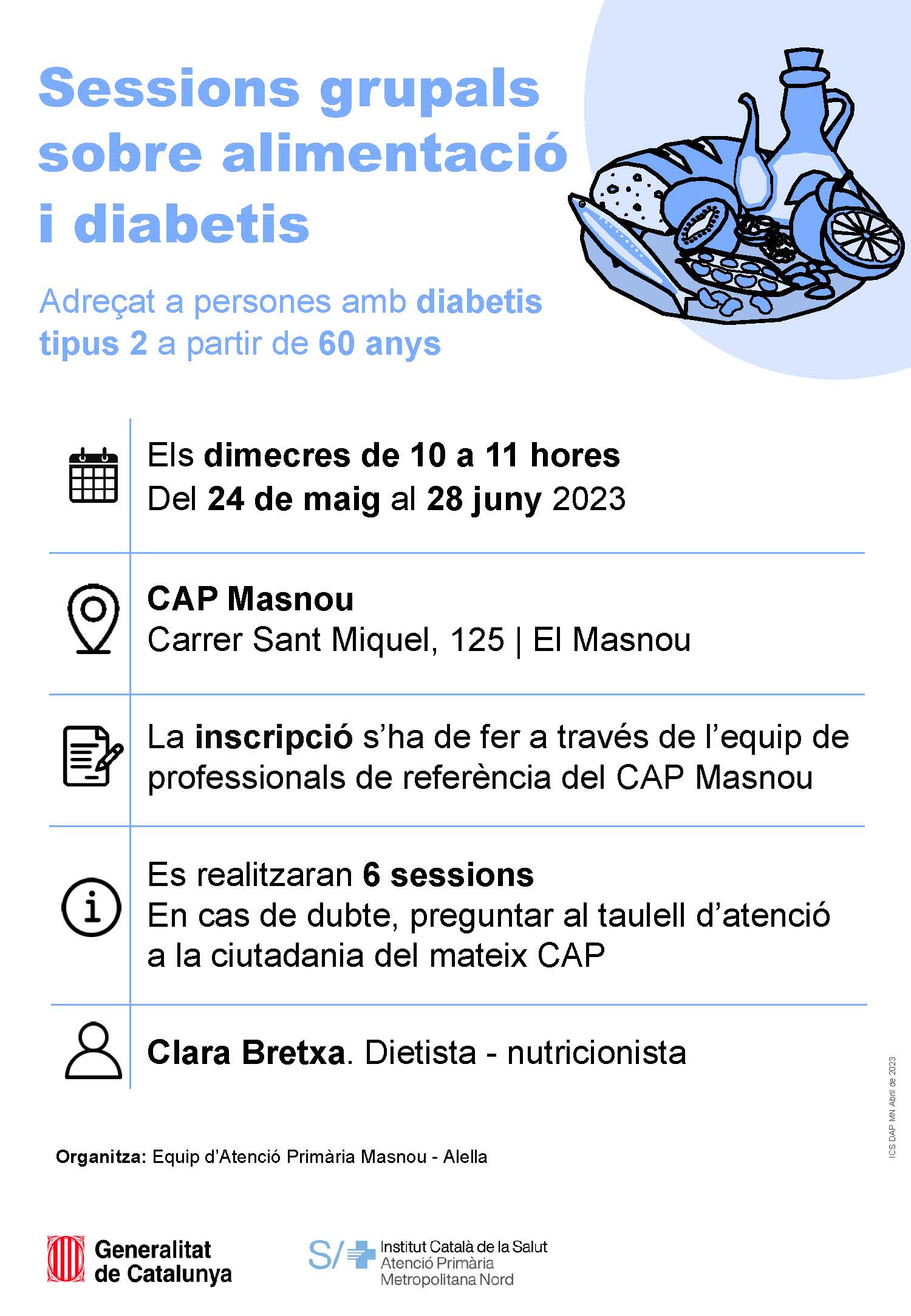 El dimecres 24 de maig arrenquen les sessions grupals d'alimentació i diabetis, adreçades a persones a partir de 60 anys que pateixen diabetis tipus 2. En aquest cas seran 6 sessions que es desenvoluparan els dimecres de 10 a 11 h fins al 28 de juny.