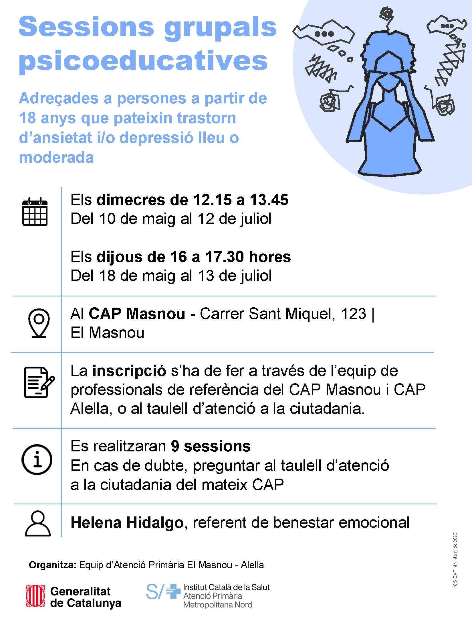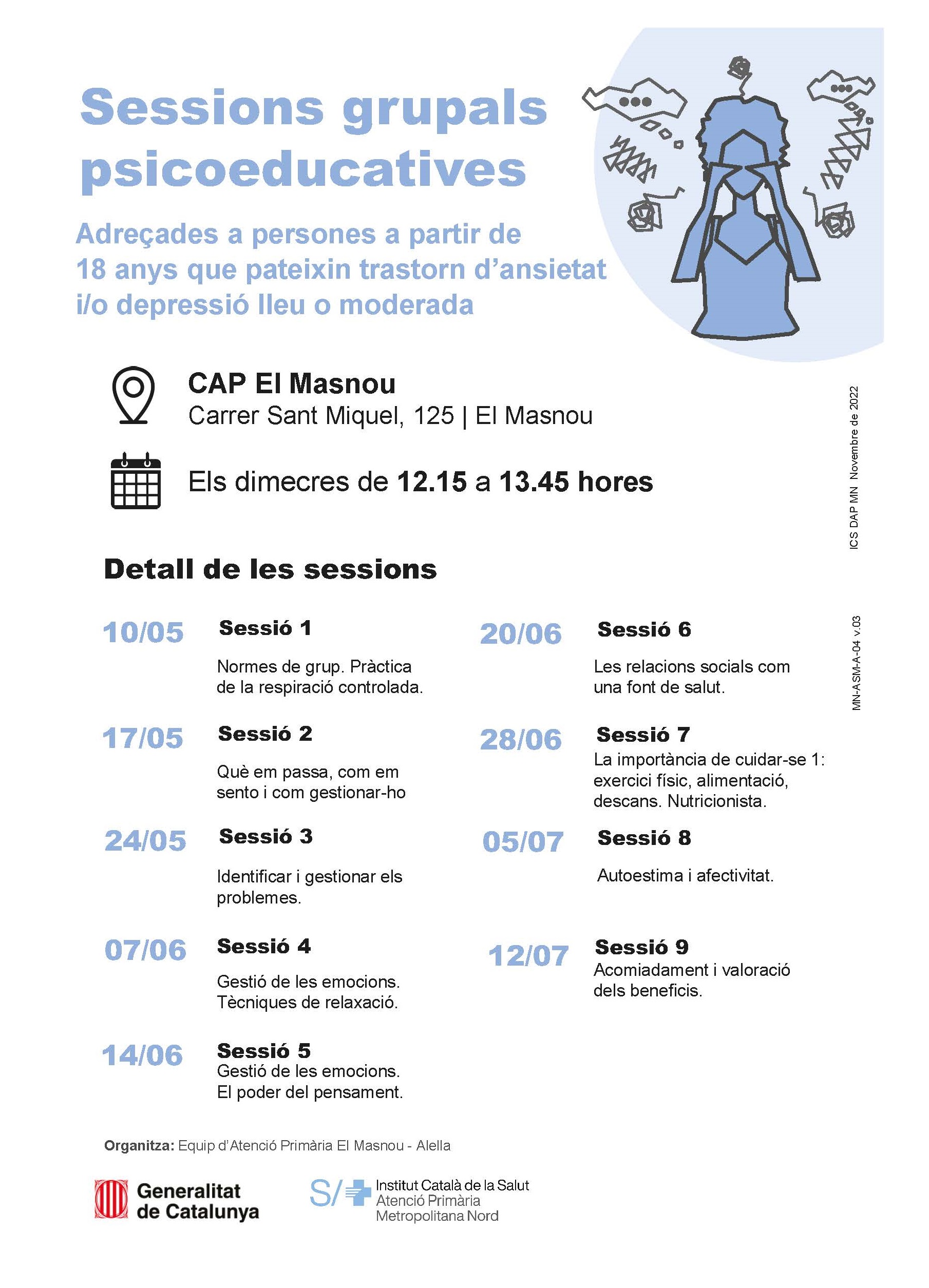 L'Equip d'Atenció Primària El Masnou-Alella inicia aquest mes de maig tres nous cicles de sessions grupals de salut comunitària adreçades a usuaris i usuàries del Consultori Local d'Alella i del CAP del Masnou. Del 10 de maig al 12 de juliol es posa en marxa la tercera edició de les sessions grupals psicoeducatives adreçades a persones a partir de 18 anys que pateixen trastorns d'ansietat i/o depressió lleu o moderada. En total són 9 sessions que es faran setmanalment en horari de dimecres de 12.15 a 13.45 h.