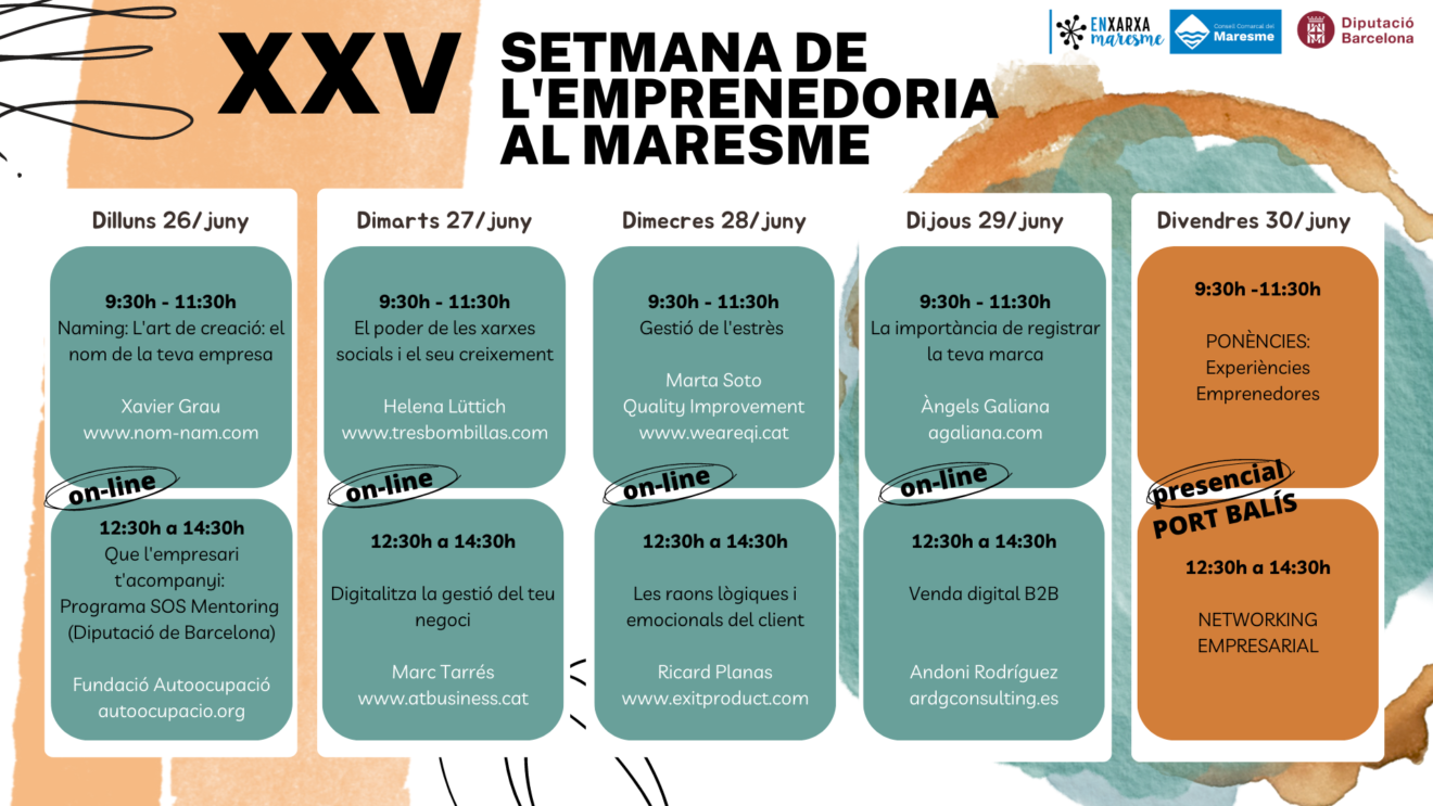 Seguint el format de la passada edició, la XXV Setmana de l'Emprenedoria al Maresme es desenvoluparà en format online de dilluns a dijous i presencial el divendres, 30 de juny, amb l'apartat de “Ponències emprenedores” i un networking per facilitar la interacció entre totes les persones assistents.