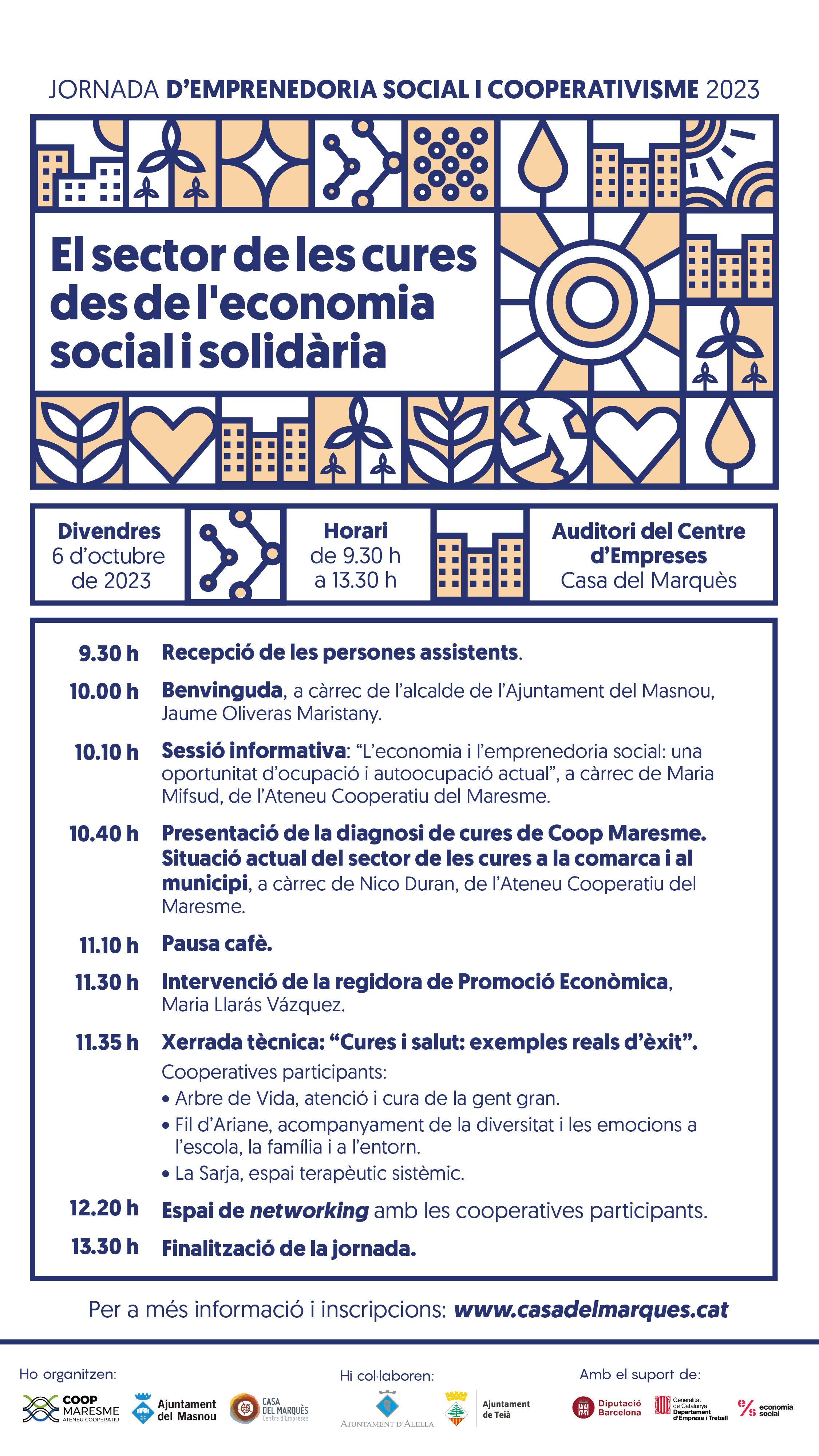 Els ajuntaments del Masnou, Alella i Teià i Coop Maresme (Ateneu Cooperatiu del Maresme) organitzen una jornada d'emprenedoria i cooperativisme adreçada al sector de les cures, des de l'economia social i solidària. A través d'aquesta jornada es pretén difondre projectes innovadors i models alternatius de creació d'empreses, promoure l'economia social i solidària així com el cooperativisme com a opció d'autoocupació. Amb la trobada es vol incentivar i promoure l'emprenedoria cooperativa als municipis, ampliar el ventall d'opcions ocupacionals per a les persones que estan en situació de recerca de feina i afavorir la relació i enfortiment de les xarxes locals d'economia social.