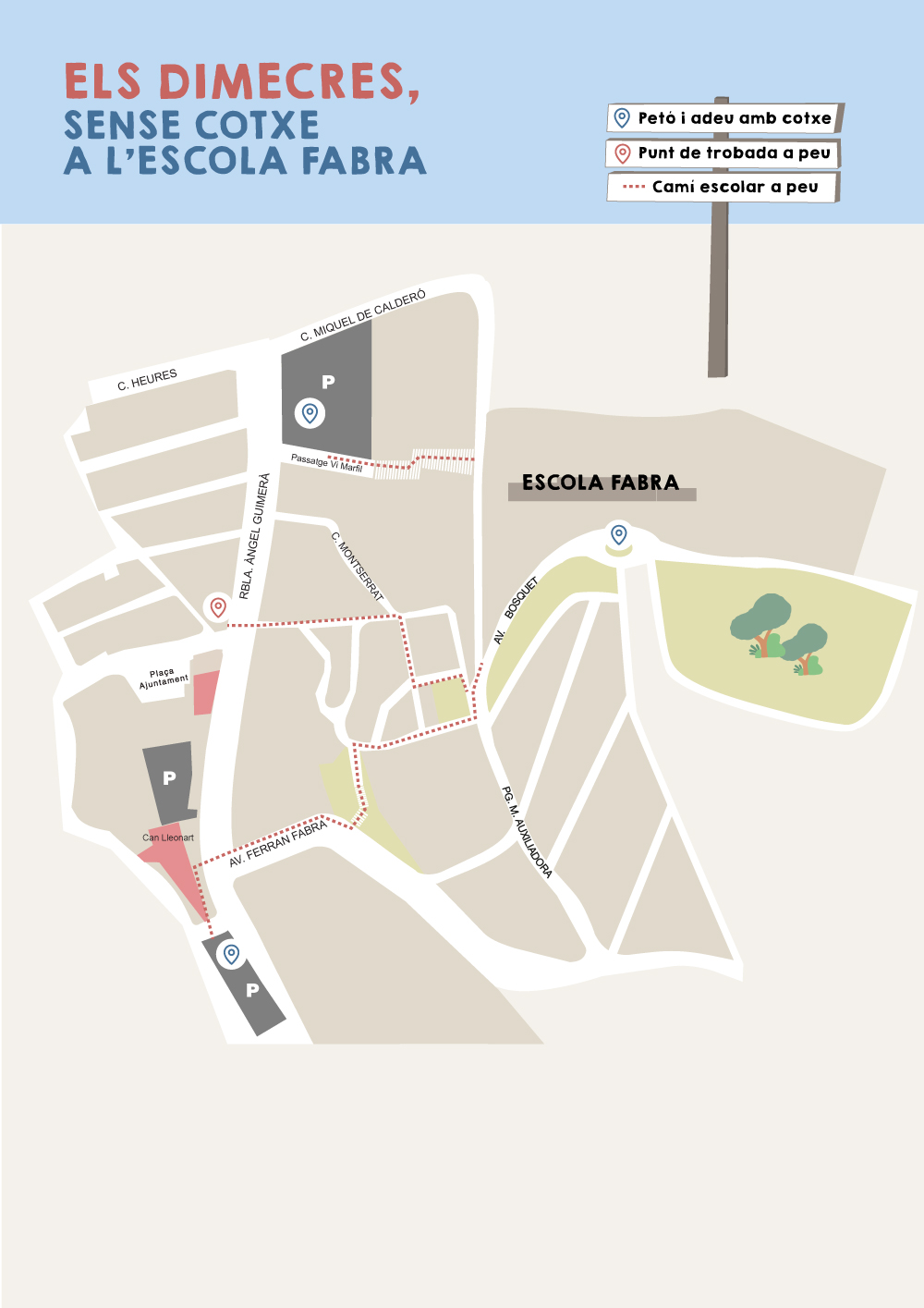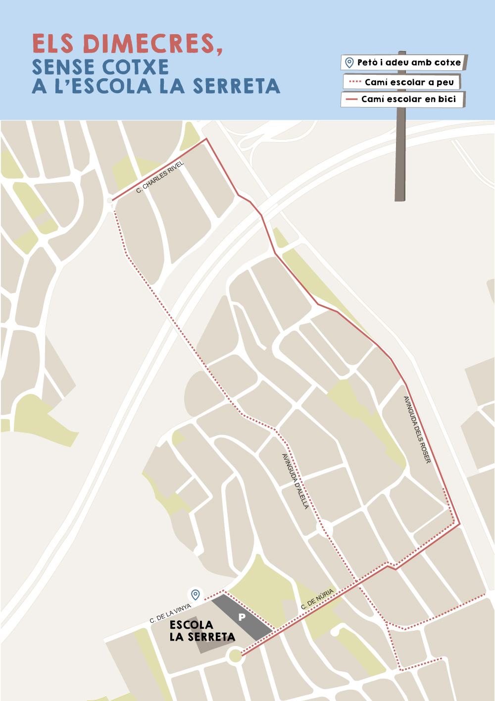 Aquí podeu consultar els plànols per anar a peu, en bicicleta o en patinet a l'Escola La Serreta o per seguir el camí escolar que porta a l'Escola Fabra, la Llar d'Infants Municipals Els Pinyons i l'Institut Alella.