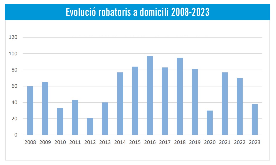 El front comú contra els robatoris comença a donar els seus fruits. L'any 2023 es va tancar amb un total de 38 denúncies per robatoris amb força a domicilis, un 45% menys dels enregistrats l'any anterior. És la xifra més baixa dels darrers deu anys, exceptuant l'any de pandèmia amb les mesures de confinament que va comportar.
