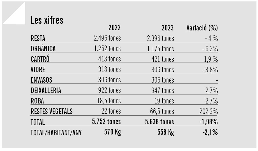 Cada habitant d'Alella va produir 558 kg de residus, 12 kg menys que l'any 2022 i 36 menys que fa dos anys. Totes les fraccions disminueixen, excepte les restes vegetals, el cartró, les aportacions a la deixalleria i la roba.