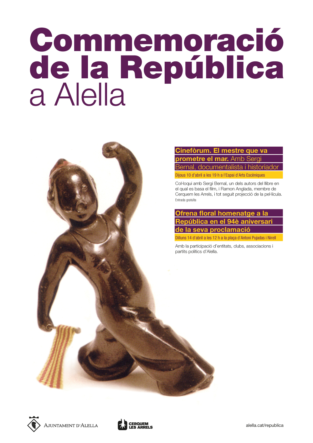 Alella commemorarà el proper 14 d'abril els 94 anys de la proclamació de la Segona República amb una ofrena floral a la plaça d'Antoni Pujadas i Nirell a les 12h. L'acte institucional és obert a la ciutadania i a totes les entitats i partits del municipi.