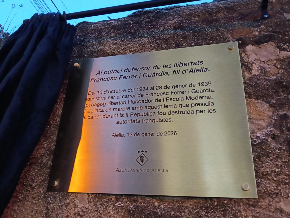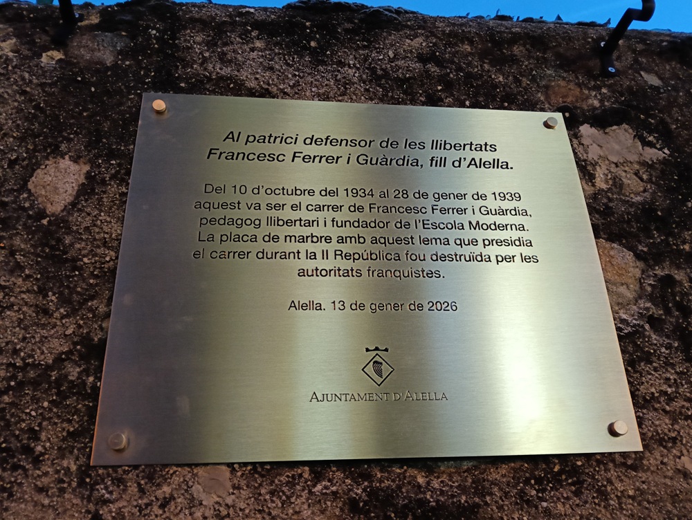 Dimarts 13 de gener de 2026, vigília del 167è aniversari del pedagog Francesc Ferrer i Guàrdia, ha estat una data important dins del procés de recuperació de la memòria històrica i de la tasca reivindicativa de la figura i el pensament de l'alellenc universal, que va deixar petjada internacionalment com a impulsor de l'Escola Moderna i defensor del lliurepensament.