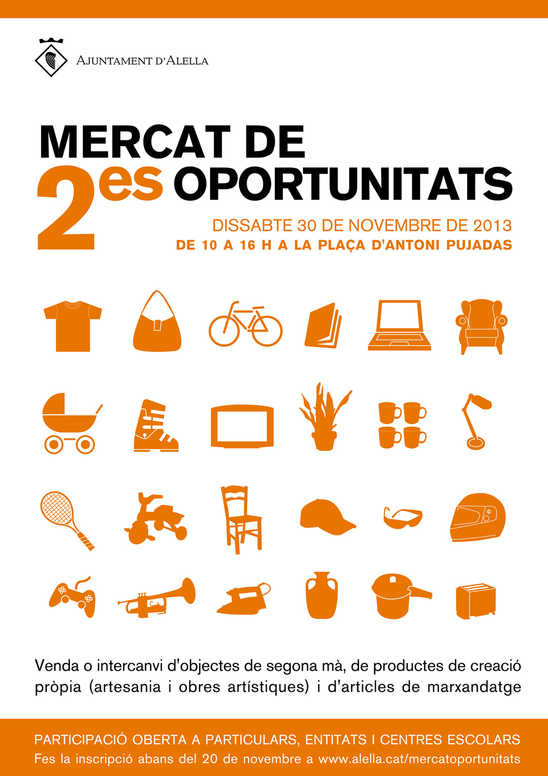 Mercat de Segones Oportunitats (2a edició). Venda, compra i intercanvi d'articles de segona mà, productes de creació pròpia no professional i d'articles de marxandatge d'entitats i centres escolars. Inscripcions de l'1 a 20 de novembre. Més informació: www.alella.cat/mercatoportunitats