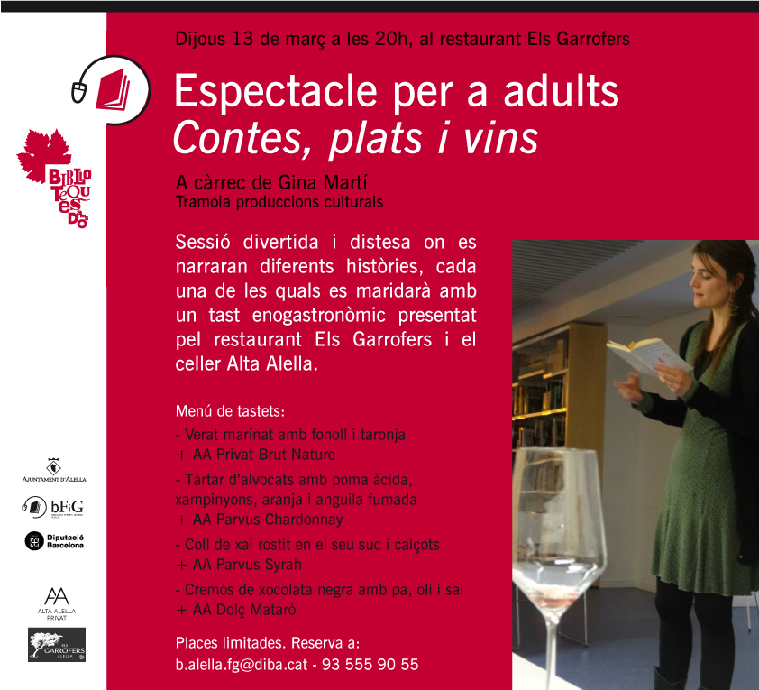 Biblioteques amb DO. Espectacle per a adults. "Contes, plats i vins". A càrrec de Gina Martí. Maridatge amb contes, menjar i vi.