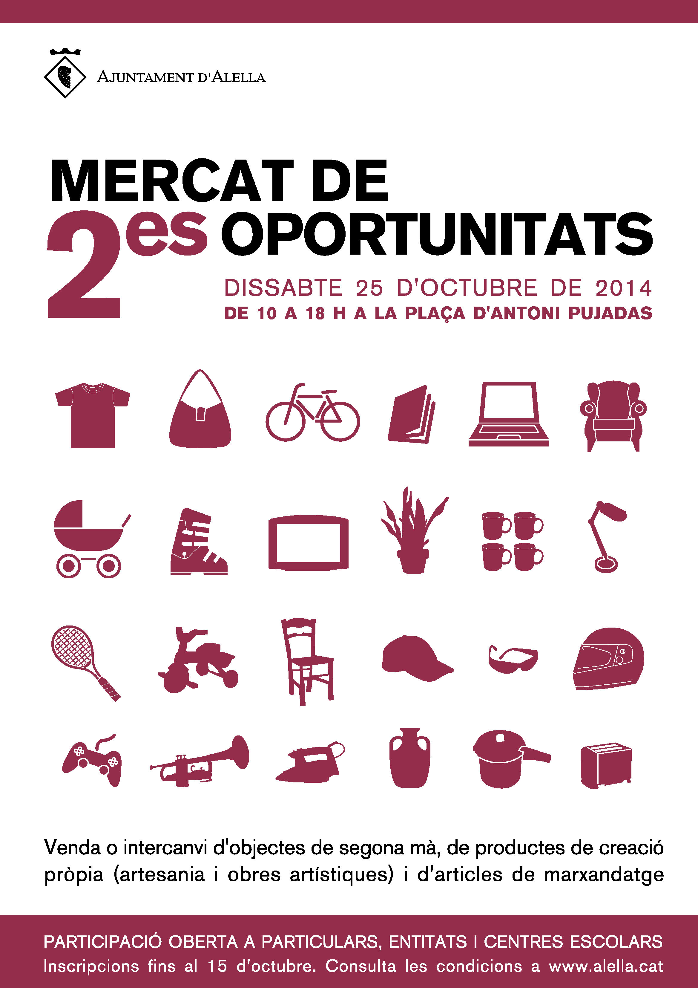 Mercat de Segones Oportunitats. Venda, compra i intercanvi d'articles de segona mà, productes de creació pròpia no professional i d'articles de marxandatge d'entitats i centres escolars. Inscripcions del 25 de setembre al 15 d'octubre. Més informació: www.alella.cat/mercatoportunitats