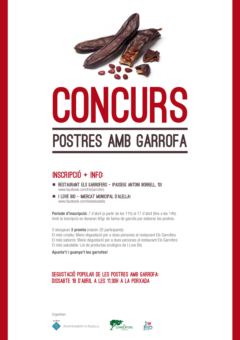 Concurs de postres de garrofa. Degustació de les postres i lliurament de premis. Inscripcions del 7 al 17 d'abril a la parada I Love Bio del Mercat Municipal.