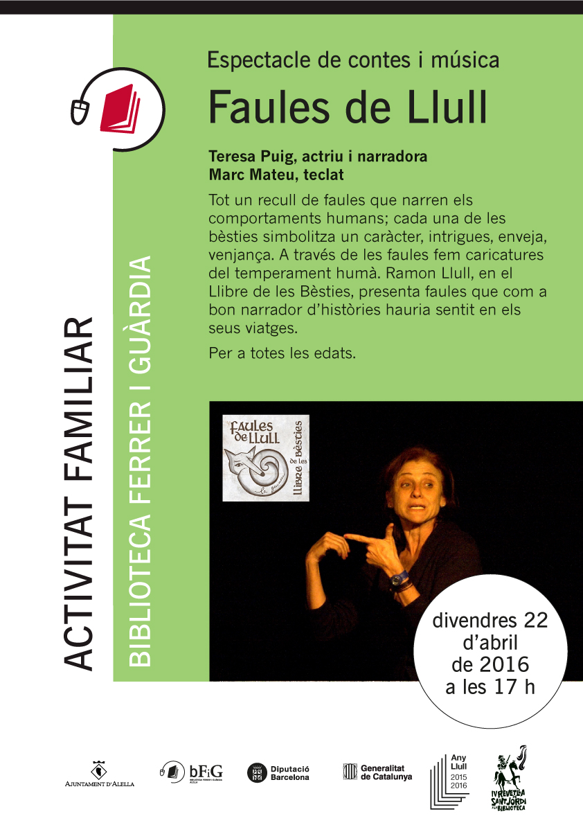 17h. Espectacle familiar de Contes i Música Faules de Llull a càrrec de l'actriu Teresa Puig i Marc Mateu, teclat.