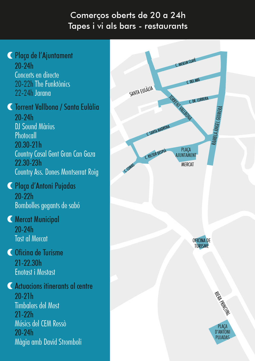Nit del comerç d'Alella. Promocions i descomptes dels comerços del centre. Tast al mercat. Tapes i vins als bars. Música, espectacles en directe i altres sorpreses.