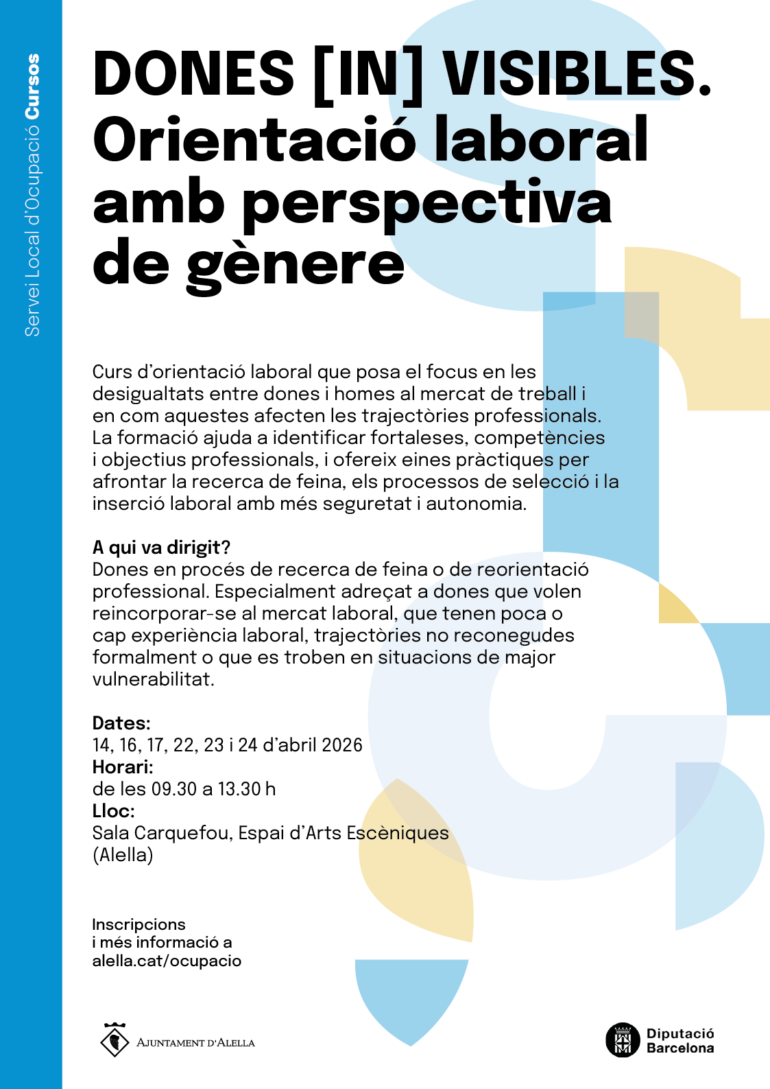 Curs d'orientació laboral que posa el focus en les desigualtats entre dones i homes al mercat de treball i en com aquestes afecten les trajectòries professionals. La formació ajuda a identificar fortaleses, competències i objectius professionals, i ofereix eines pràctiques per afrontar la recerca de feina, els processos de selecció i la inserció laboral amb més seguretat i autonomia